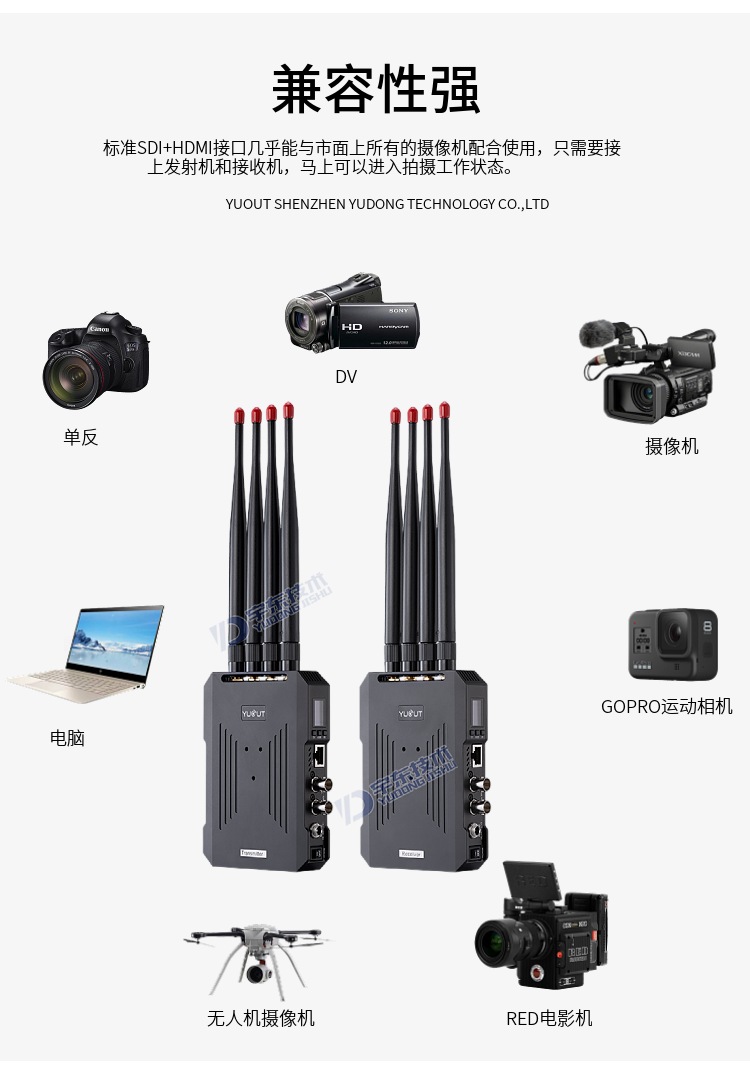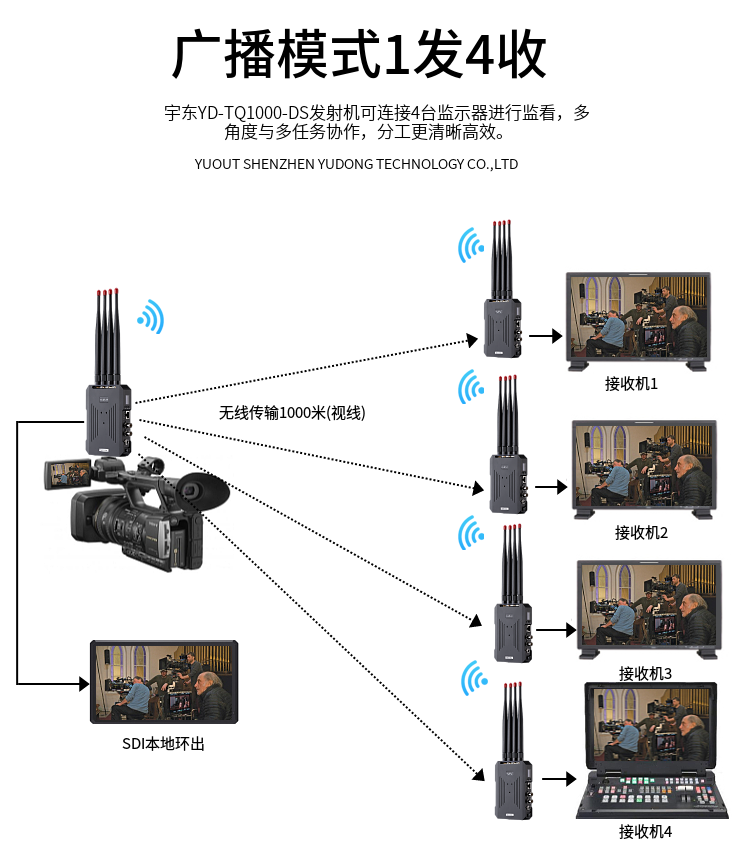 YD-TQ1000-DS是由發(fā)射端和接收端組成,支持3G/HD/SD-SDI或者HDMI 1080P全高清信號傳輸,作為圖傳時,視線無阻擋傳輸距離1000至1500米。頻段采用5.1-5.8GHz,支持用戶手動通信頻點調(diào)整,為發(fā)射端和接收端配對,還支持廣播模式,可以把多個接收端設(shè)置成跟一個發(fā)射端相同的頻點,實現(xiàn)一發(fā)多收。純硬件連接操作,簡單可靠。設(shè)計精巧,可以F970 、V口、 電源適配器三種供電方式,方便移動拍攝。廣泛應用于電影拍攝、應急搶險、消防、人防、武警、突發(fā)事故單兵視頻采集等場合;真正實現(xiàn)高清無線傳輸、移動實時傳輸、