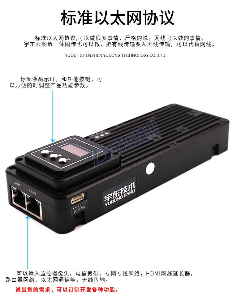 YDTD9000宇東視頻數(shù)據(jù)無線圖傳系統(tǒng)采用工業(yè)級無線高速率數(shù)據(jù)傳輸技術(shù),非視距,非WIFI,集合正交頻分復(fù)用時(shí)分多址調(diào)制及MIMO多進(jìn)多出容量技術(shù),完全基于IP互聯(lián)網(wǎng)協(xié)議,實(shí)現(xiàn)全雙向透明通道寬帶傳輸。非視距:500-1000米;地面視距:3000-15000米;空對地:20000米。系統(tǒng)為純硬件連接,即插即用;創(chuàng)新性液晶一體化設(shè)計(jì)、豐富的CAN總線、RS-232、TTL電平接口,更好的用戶角度體驗(yàn)。通道最大支持30Mbps吞吐量,可廣泛應(yīng)用于工業(yè)自動(dòng)化、工業(yè)機(jī)器人、無人機(jī)、視頻監(jiān)控等通信工作。