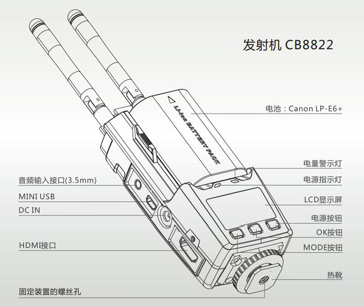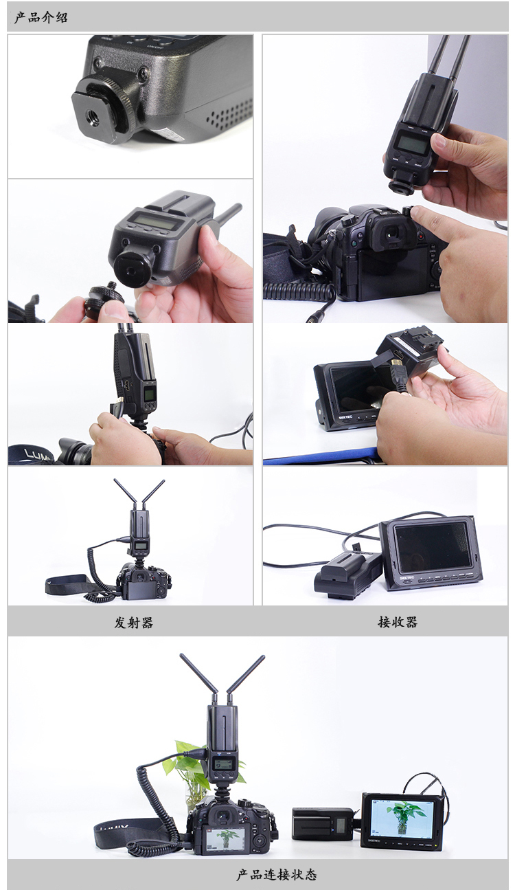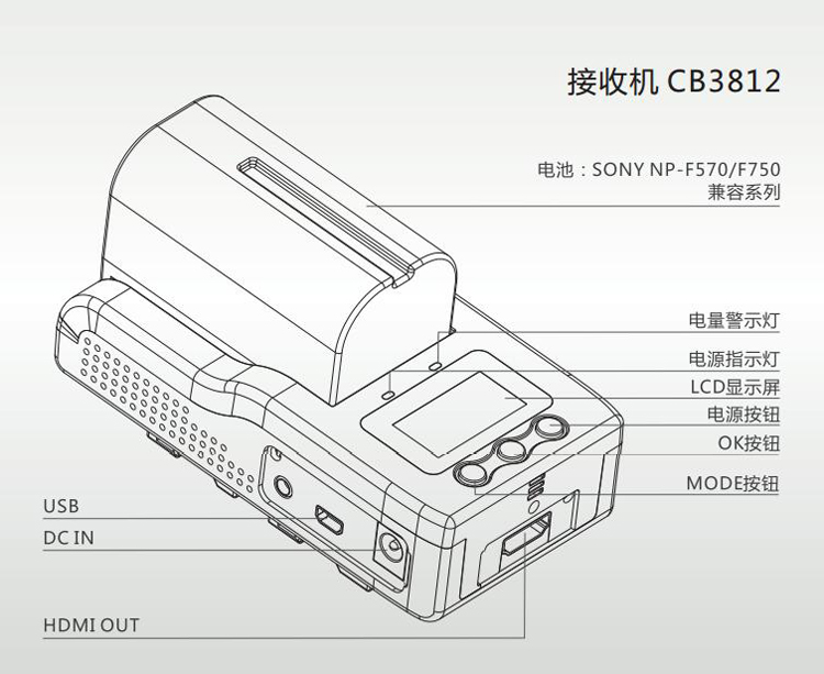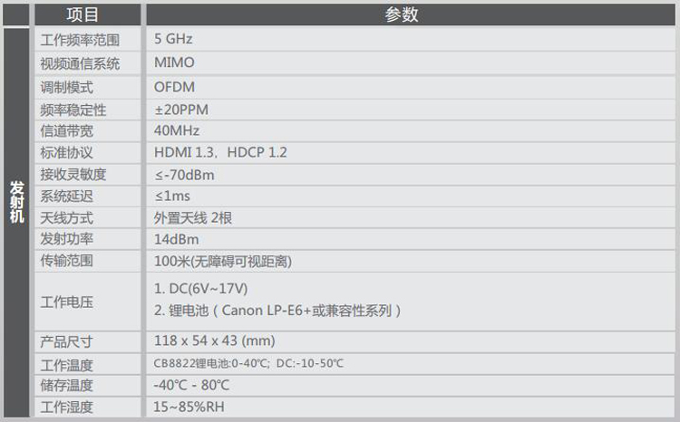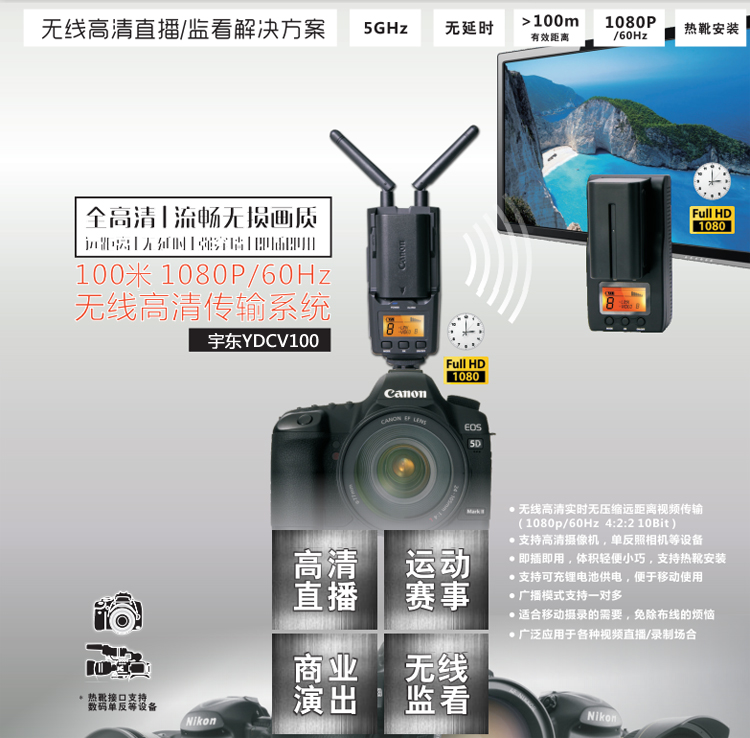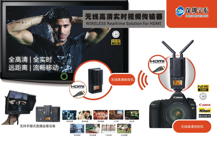 100米HDMI無線高清視頻傳輸器 HDMI 100米無線傳輸器 拍電影專用 適用攝像機、照相機等帶有HDMI輸出的便攜高清視頻設備; -支持DC供電(電源適配器12V、寬電壓范圍的應急電源(6V~17V)或安裝鋰電池 (SONY NP-F570/F750/Canon LP-E6+及兼容系列電池)供電,內部有防止電源范姐的保護設計; -正面結構為鋰電池卡座,用來安裝SONY。 隨著高清影視設備越來越廣泛的應用,其布線過程中也出現了多方面的問題,如線材成本較高,使用壽命短,如果現場保護不夠,路過人群的踩踏可能影響線材表現,甚至引發直播事故。本方案為影視直播場景提供了更加便捷安全的解決方案,其遠距離傳輸多頻點支持配合大容量鋰電池系統,即插即用設置,能充分的滿足各種室內外拍攝需求,尤其是免布線的特點,將帶給您更安全,更便利的專業體驗。