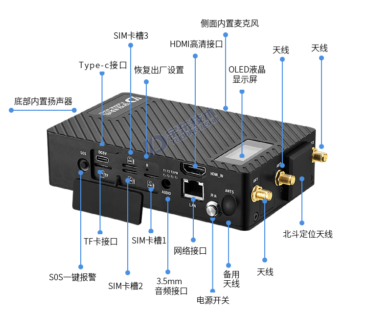 13) 內置 OLED 屏可顯示設備網絡狀態、藍牙、電量、北斗、WIFI、設備地址等信息無 3/ 4/5G 公網信號情況下可將視頻存儲于設備 TF 卡內;