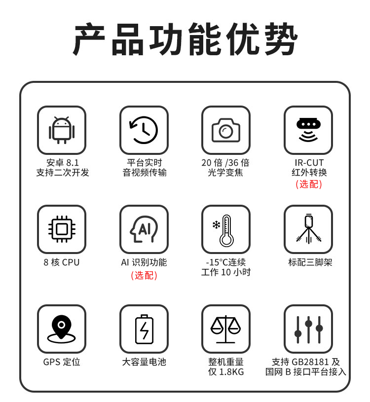 4G高清AI智能布控球 * AI智能識別,更清晰·快傳輸·識強(qiáng) * 輕量化,整機(jī)重量僅1.8KG * Android 8.1 8核,20倍/36倍光學(xué)變焦 * AI智能識別,可人臉識別、車輛識別、安全帽識別、工服識別、銘牌識別等等。 * 2T大容量,支持雙sim卡、雙t卡,最高2T內(nèi)存 * 在線傳輸,作業(yè)現(xiàn)場隨時看,可視化平臺調(diào)度指揮 * 電子地圖實(shí)時檢測人員、設(shè)備、事件、區(qū)域信息 * 第一時間掌握現(xiàn)場情況,遠(yuǎn)程決策,統(tǒng)一協(xié)調(diào)?